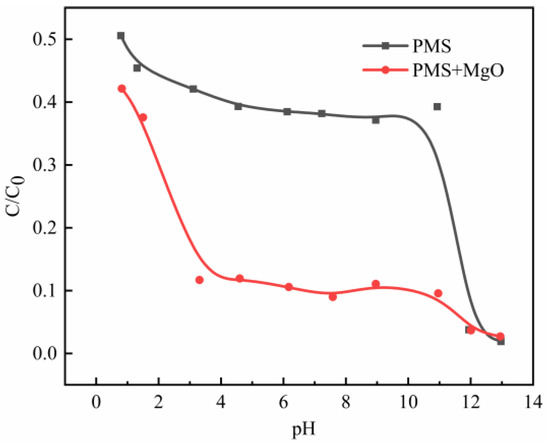The effect of hydroxyl in solution on catalysis process can be judged by comparing the degradation differences between PMS/MgO and bare PMS systems. The results are shown in Figure 6. When the initial pH value is about 1, the degradation efficiency in both systems is similar and not good, but the PMS/MgO system is slightly better. On the one hand, this is due to the decomposition of PMS is inhibited at low pH value [29]. On the other hand, MgO is alkaline oxide that is unstable under acidic conditions. As shown in Figure S6, the dissolution rate of MgO gradually increases with the decrease of pH value, and MgO almost completely dissolves when the pH is about 1. Then, with the increase of pH value to about 3, the degradation efficiency of PMS/MgO system increases dramatically, and the proportion of residual MB decreases rapidly from about 40% to about 10%. As a reference, the degradation efficiency of bare PMS system is slowly improved. As reported, the catalytic effect of hydroxyl group to PMS can only be achieved under alkaline conditions [9]. However, the excellent degradation effect of PMS/MgO system in the range of pH of 3 to 11 indicates that MgO contributes an extra excellent catalytic effect in addition to hydroxyl groups. Subsequently, the catalytic efficiency of both systems remains stable in the pH range of 3 to 11, namely, MB residual rates are kept at about 10% and 40% in PMS/MgO and bare PMS systems, respectively. Finally, when the pH value is more than 12, the degradation efficiency of bare PMS system increases greatly, while that of PMS/MgO system increases gradually. Ultimately, the degradation efficiencies of both systems are completely equal. At this point, the hydroxyl group dominates the catalysis.
