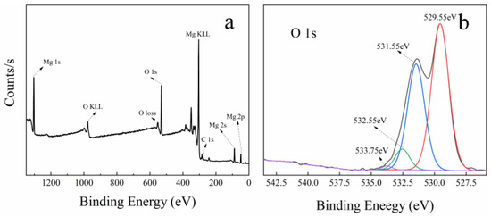 Figure 7 shows the XPS spectra of MgO at 50 nm (a and b), MgO at 1 μm (c and d), and MgO at 10 μm (e and f). In the full scan of samples (a, c, and e), only the characteristic peaks of Mg, O, and C can be found, which points out the high purity of the three MgO samples. Meanwhile, the O 1s high-resolution scans of samples are shown in Figure 7b,d,f. On the low binding energy (BE) side, three samples have two O 1s characteristic peaks at 529 and 531 eV. The characteristic peak at 529 eV is considered to be the lattice oxygen in Mg–O, and the characteristic peak at 531 eV is attributed to the lattice oxygen in Mg–OH [45,46]. This confirms the existence of hydroxyl groups on the surface of MgO, which contributes a little to the catalysis of PMS.