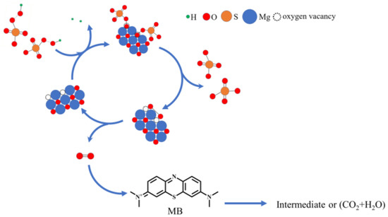 With the development of nonradical catalysis technology, researchers have found that singlet oxygen is produced in activated PMS by ketones, quinones, carbon materials, and so on. The unsaturated carbon atoms in the carbon material and the carbonyl group in the ketones and quinones are catalytic active sites, acting as intermediate mediators to accelerate the decomposition and interaction of persulfate molecules, to produce singlet oxygen [34]. New findings in this article determine that oxygen vacancies in the surface of MgO are also highly active sites to catalyze PMS. Dong et al. found that the abundant oxygen vacancies not only increased the reducibility of the catalyst, but also facilitated the electron transfer from PMS and organic molecules to the catalyst [55]. Therefore, in the proposed mechanism, based on the abovementioned results and previous reports, we refer to the literature and speculate that oxygen vacancy in the MgO surface acts as mediator, which temporarily receives oxygen atoms of hydroxyl groups on , and then promotes the breakage of peroxide bands and accelerates the combination of broken oxygen atoms, to form singlet oxygen [56], as shown in Figure 9. It is speculated that the possible path of catalysis of PMS by oxygen vacancy on the MgO surface is presented in Equations (5) to (6).