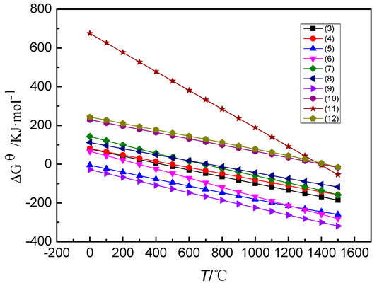 The standard Gibbs free energy changes (ΔGθ) are plotted as a function of temperature in Figure 2 for Equations (3)–(12), demonstrating that all reactions were notably temperature-dependent.