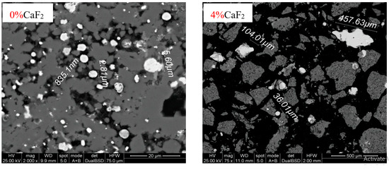 Figure 4 presents the SEM image of reduction calcines (CaF2 dosage 0% and 4%), where the generation of many light alloy particles and irregular distribution in the gray matrix was observed. The grain size of the alloy in calcines at 0% CaF2 dosage was very small (<10 μm). However, the grain size of the alloy in calcines at 4% CaF2 dosage had clearly increased, ranging from dozens to hundreds of microns.