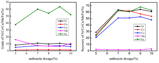 Figure 5 presents the analysis of the effect of anthracite dosage on grade and recovery. The metal recoveries improved with increased anthracite dosage and reached the maximum values. This demonstrates that the dosage of less than 7% has a substantial influence on valuable metal recovery. The grade of Ni, Co, Cu, and Fe increased constantly, while the grade of Mn decreased with increasing anthracite dosage. After 7% dosage, we observed that increasing the anthracite did not improve metal recovery. Furthermore, beyond 9% dosage, the grade of Mn increased in the magnetic concentrate with an increase in anthracite dosage. To some extent, excessive coal was needed to improve the reducing atmosphere. However, when the anthracite dosage was greater than 9%, superfluous anthracite lead to increased Mn and MnC, and generated greater amounts of ash in the magnetic concentrates. This was found to decrease the grade of Cu, Co, Ni, and Fe. Thus, an anthracite dosage of 7% is optimal for recovering valuable metals.