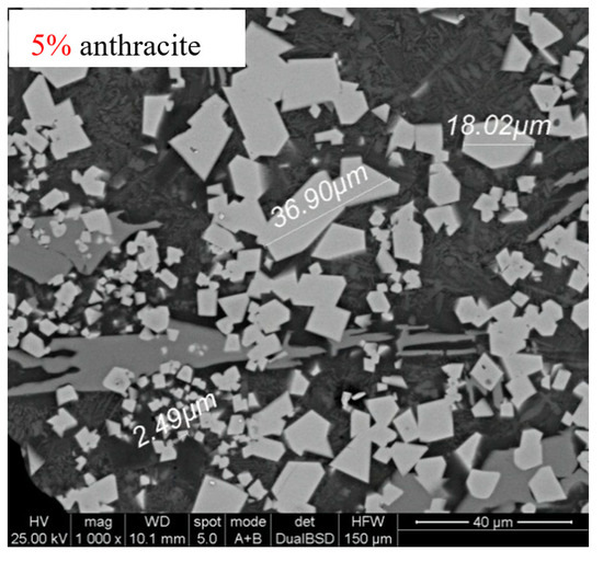 Figure 6 shows the SEM image of reduction calcines (anthracite dosages of 5%, 7%, and 9%). We observed that the reaction of metalized reduction was insufficient with an anthracite dosage of 5%, and there were no typical round alloy particles in calcines. However, there were some large typical round alloy particles in calcines with an anthracite dosage of 7% and 9%. Additionally, the grain size of the two sets was very similar.