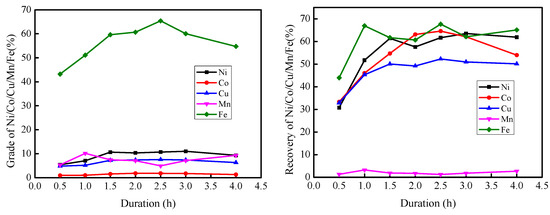 Figure 7 illustrates the impact of reaction duration on metal recovery. The results indicate that the recovery of Cu, Co, and Ni gradually increased from a roasting period of 0.5 h up to 2.5 h. However, metal recovery was unaffected by reaction times beyond 2.5 h. The recovery of Mn initially increased slightly, then decreased before 2.5 h, and increased beyond 2.5 h. The grades of Ni, Co, Cu, and Mn increased constantly before 1.5 h and then plateaued. Furthermore, the grade of Fe increased before 2.5 h and decreased beyond 2.5 h. This suggests that short reaction duration (<2.5 h) may lead to an inadequate response in the metalized reduction process. Moreover, the low metal recovery suggests that the generated alloy particles were not recovered well by magnetic separation, as there was insufficient time to grow up and aggregate adequately. The decrease in recovery and grades beyond 3 h may be due to the tiny alloy particles involved in the generated silicate of tailings. As such, 2.5 h was deemed sufficient for good recovery and grades.