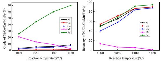 Figure 11 depicts the effect of reaction temperature on recovery and grade, suggesting that an increase in temperature from 1000 to 1100 °C led to a sharp increase in the recovery of Cu, Co, Ni, and Fe. However, increasing the temperature beyond 1100 °C led to a slow increase in recovery. The grades of Cu, Co, Ni, Fe, and Mn in the magnetic concentrates increased constantly with reaction temperature. In contrast, the recovery and grade of Mn decreased with an increase in reaction temperature. This indicates that the reaction temperature is highly influential on metal recovery and grades. Furthermore, the migration and aggregation behavior of iron-based alloy particles substantially improved with increased reaction temperature. In terms of kinetics, a higher temperature resulted in a faster metallization reaction rate. However, if the reaction temperature was greater than 1100 °C, it led to a sintering adhesion phenomenon of the crucible. This was found to seriously affect the follow-up process operations. As such, 1100 °C was found to be the most appropriate reaction temperature.
