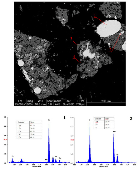 The mineral composition of the four color areas is very different. The bright white point 1 is the alloy phase formed by Fe, Co, Ni, and Cu. The light gray point 2 is the ferro manganese sulfide phase, the dark gray point 3 is the manganese olivine phase, and the black point 4 is the glass phase.