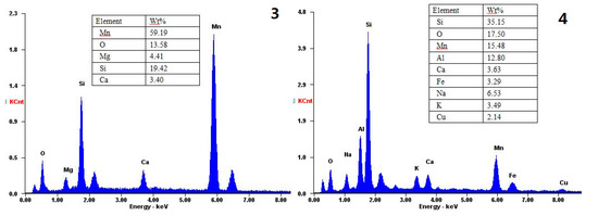 The potassium dichromate titration method was used for the high-grade manganese and iron test [24]. The other chemical compositions of the concentrates and the tailings were analyzed using an inductively coupled plasma optical emission spectrometer (ICP-OES, Agilent 700, Agilent technology (China) Co. LTD., Beijing, China). The semi-quantitative mineralogical analyses of the ocean polymetallic nodules were conducted using X-ray diffraction (XRD) (Rigaku, Tokyo, Japan) with Cu-Kα X-radiation, and the scan rate was set at 20° 2θ/min. Scanning electron microscopy (SEM; KYKY-2800, KYKY TECHNOLOGY CO., LTD., Beijing, China) and energy dispersive spectroscopy (EDS; EDAX, Genesis, EDAX Inc, Beijing, China) were performed on the concentrates and the tailings. EDS was performed on selected points to obtain the local composition of the sample.