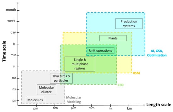 Levels of length and time alongside the modeling and optimization tools analyzed in this manuscript (CFD—computational fluid dynamics; RSM—response surface methodology; AI—artificial intelligence; GSA—global sensitivity analysis).