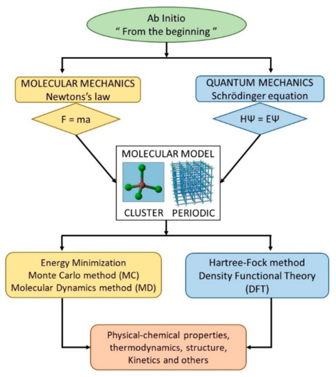 Molecular modeling tools consist of calculating the total energy of the molecular (isolated cluster) or periodic system (crystalline or amorphous structure) under investigation. Two fundamental approaches are typically used: molecular mechanics and quantum mechanics. Figure 2 shows a diagram of molecular mechanics and quantum mechanics methods. Both methods are related and are used to examine the structure and energy of a molecule or periodic system [2].