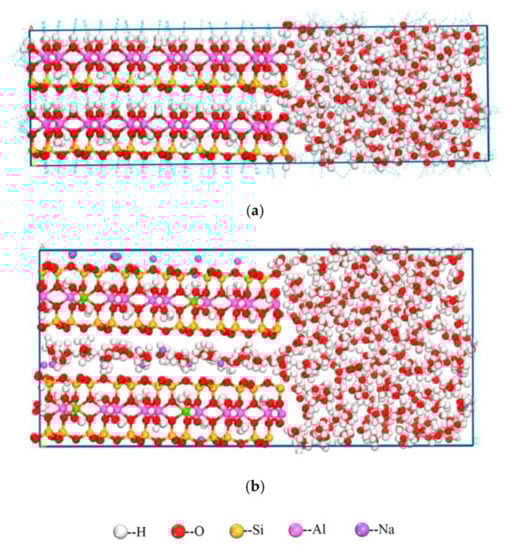 Ma et al. [11] studied the impact of clay minerals (kaolinite and montmorillonite) on the dewatering of coal slurry using a molecular-simulation study, followed by an experimental section to corroborate data accuracy. The molecular simulation results show different adsorptions of water on the side surfaces of kaolinite and montmorillonite. Water molecules could scarcely diffuse into kaolinite from the edge but could easily propagate into the montmorillonite layers from the edge surface because of the existence of a hydrated cation in montmorillonite and a weak interlayer connection. This means that a small amount of montmorillonite caused a major decrease in the filtration velocity and a huge rise in the moisture of the filter cake. Therefore, the efficiency of the dewatering process has a strong dependency on the interaction between kaolinite/montmorillonite and water. Figure 3 shows an equilibrium snapshot from an MD simulation of water adsorption on the side surfaces of kaolinite and montmorillonite. Another study of water absorption on a mineral surface was conducted by Wang et al. [12]. They evaluated the water adsorption on the β-dicalcium silicate (cement) surface from DFT simulations. This work studied how to improve the hydration rate on the cement surface. Then, they studied the adsorption mechanics of the water/cement system. The cement hydration is a crucial step that controls the final properties of cement materials. However, the industrial production of cement produces a large amount of CO2 emissions and energy consumption. For this reason, understanding cement hydration mechanisms was the main motivation of this study to provide an academic basis for the design of new environmentally friendly cement. Finally, Kubicki et al. [13] studied the vibrational spectra on clays by DFT approaches. Herein, they presented an overview of quantum mechanical calculations to predict vibrational frequencies of molecules and materials such as clays and silicates. For creating a realistic model, the vibrational frequencies were calculated by two analytical methods, Raman and infrared intensities.