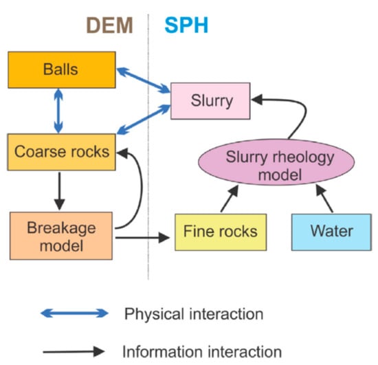 Example of the physical interactions, the model components, and the data flows in discrete element simulation–smoothed particle hydrodynamics (DEM–SPH) modeling of wet grinding [53].