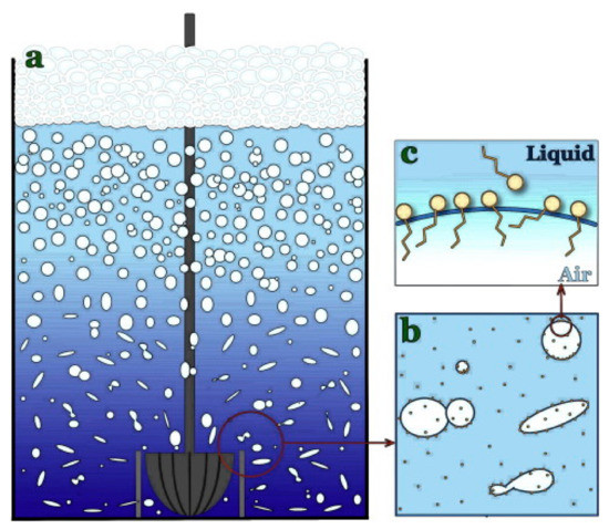 Relationship between scales in bubble behavior in flotation (a) macro-scale: cell level, (b) meso-scale: bubble coalescence and breakup studies, and (c) micro/nano-scale: molecular interactions [57].