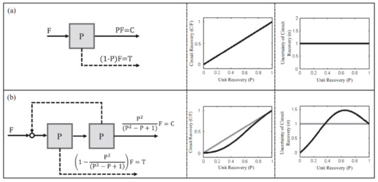 The most important hybrid method for designing mineral processing facilities is linear circuit analysis (LCA). This technique provides fundamental insights into how unit operations interact and respond when arranged in multistage processing circuits [61]. The method, proposed by Meloy [62] and then developed by Meloy, Williams, and Fuerstanou over several years [63,64,65,66], consists of representing the separation yield of a process unit by a transfer function, and then expressing recoveries of the concentrate and tailing as a function of this transfer function. This mass balance approach is extended to the circuit by expressing the global recovery of the circuit as a function of the transfer function of each process unit. Figure 7 shows an example of LCA formulation.