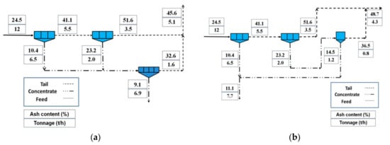 Comparison of flotation circuit design: (a) design and ash contents of the initial circuit, (b) design and ash contents of the new circuit, adapted from Pirouzan et al. [95].