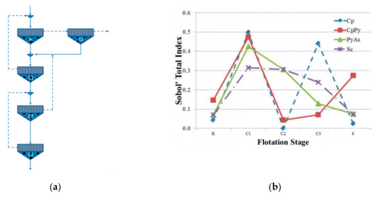 (a) Designed circuit using the methodology. (b) Sobol total index for each stage and for chalcopyrite (Cp), chalcopyrite–pyrite (CpPy), pyrite–arsenopyrite, and silica (Sc) [169].
