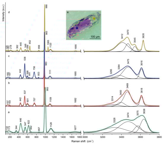The hexagonal prismatic crystals of the minerals corresponded to the bentorite-ettringite series from Ma’ale Adummim locality were characterized by the gradual substitution of Al by Cr3+, which was reflected in the color change from colorless (ettringite) to dark-violet (bentorite) (Figure 2e). The Raman spectrum of dark-violet bentorite (the base part of the crystal showed Cr > Al) (Figure 2c) was almost identical to the bentorite spectrum from Arad Stone locality (Figure 2b). Small differences were observed in the spectral range associated with asymmetric bending vibrations ν4 of the (SO4)2− group, which were weakened in bentorite from Ma’ale Adummim, and instead of the one band, we observed two at 598 and 641 cm−1 (Figure 2c). Moreover, the low intensity band connected with Al-OH bending vibrations at 853 cm−1 was revealed in this spectrum. It is highly probable that the presence of this band was connected with the crystal orientation during the measurements because it was also observed in the spectrum of the transparent part of the crystal (Figure 2d). The colorless part of the crystal (Al > Cr) was identified as ettringite (Figure 2d). Its Raman spectrum was very similar to the spectrum presented in Figure 2a. Differences were noted in the intensity of bands and the presence of a band at 1065 cm−1, which was attributed to the symmetric stretching vibrations ν1 of the (CO3)2− group.
