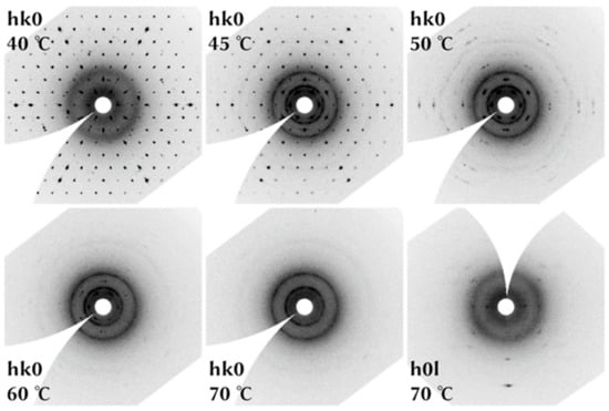 The evaluation of the high temperature data showed that the crystal was virtually unchanged up to 40 °C. The datasets collected at 35 and 40 °C exhibited the same lattice parameters (within e.s.d’s) and similar average I/σ(I) values of the integrated reflections: 26.1 and 25.8, respectively. However, the average I/σ(I) at 45 °C was 9.7, only, which indicated that the crystal had started to decompose. Comparing the maximum frame intensities of the 40 and 45 °C measurements revealed that these intensities were decreasing during the 45 °C data collection. The average I/σ(I) value of all reflections at 50 °C was 1.5. The remaining bentorite Bragg peaks could be detected up to 65 °C. With the onset of the decomposition at 45 °C, weak powder rings occurred. Powder rings originating from randomly oriented crystallites should form spheres in the three dimensional reciprocal space. However, the powder rings of the decomposition product were two-dimensional and oriented perpendicular to c* of the decomposing bentorite crystal. Consequently, one axis of all of the crystallites was still parallel to c*. Further, we conclude that this (reciprocal) axis was doubled with respect to bentorite, as only every second layer (hkl, l = 2n) exhibited powder rings. The strongest of the powder rings were observed at d-values of ca. 7.39, 6.02, 4.28, 3.32, and 2.56 Å (Figure 4).
