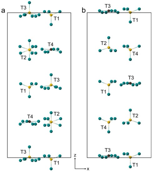 In general, bentorite exhibited the same structure as Cr3+ bearing ettringite []; however, the distribution of three (SO4)2− tetrahedra and one (CO3)2− in the channels was different (Figure 6). In both structures, partial substitution of (SO4)2− for (CO3)2− groups in the channels was observed. In the studied bentorite, T1 and T4 sites had an S/C ratio equal to 0.940/0.060 and 0.809/0.191, respectively, while in the structure reported by Seryotkin et al. [], a similar substitution was noted at the T3 site with the S/C ratio of 0.91/0.09. In addition, in Cr3+ bearing ettringite, the T3 tetrahedron was rotated around the three-fold axis, while the almost fully occupied by sulfur T2 site was rotated through 180°, one relative to the other, according to the occupation of O18 and O19 atoms with the ratio 0.80/0.20, respectively (Figure 6a). In turn, in the bentorite structure, the rotation of sites occupied simultaneously by (SO4)2− and (CO3)2− groups was not affirmed (Figure 6b). Some similarities were also noted between these two structures, e.g., the T1 site in the structure performed by Seryotkin et al. [] and the T2 site in the structure presented in this paper were fully occupied by (SO4)2− groups and did not show any type of disorder (Figure 6). Moreover, one of the four sites in both structures was partially occupied by (CO3)2− groups, and in Cr3+ bearing ettringite, the occupancy of this site (T4) was equal to 0.119 [], whereas in bentorite (T3) to 0.25.