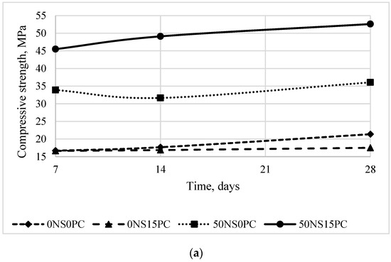 Different compositions resulted in very different compressive strengths (Figure 3a). Surprisingly, 0NS0PC samples achieved a higher compressive strength value (21.4 MPa) than the samples with additional OPC (0NS15PC) of 17.51 MPa, despite the fact that the sample density of 0NS15PC was higher at 2084 kg/m3, when 0NS0PC was 2043 kg/m3. The negative effect of OPC additive contradicts with the previous work carried out using the alkali activated mortar with the OPC additive [20]. The contributed factors could be different curing conditions if compared to our previous work [21]. The mortar samples were cured at elevated temperatures for the entire duration of the experiment (28 days), while concrete was cured at 60 °C only for 48 h.