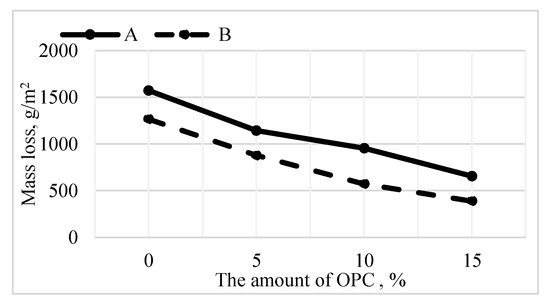 Additional OPC influence on alkali-activated concrete resistance to repetitive freeze/thaw. Notes: A—FA + NaOH; B—NaOH + Na2SiO3.