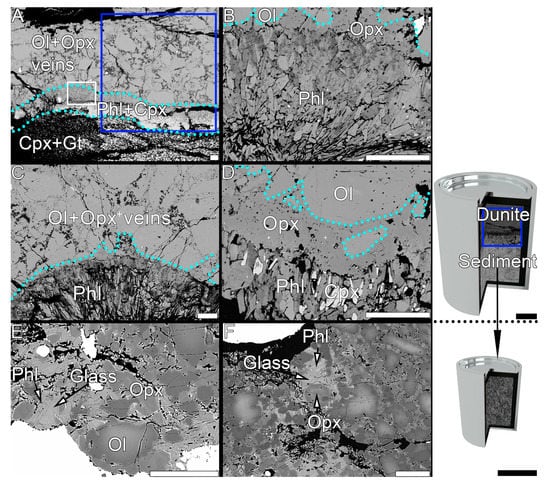 However, the spatial separation of phlogopite from orthopyroxene in the experimental reaction zones implies that this reaction occurs stepwise: the incongruent crystallization of phlogopite leads to the emergence of an SiO2-rich fluid that migrates and reacts with olivine to cause the crystallization of orthopyroxene beyond the phlogopite-enriched layer. The initial silica-rich melt would produce orthopyroxene barriers that limit the width of the reaction zone [31], whereas fluid is much more mobile and infiltrates more quickly along olivine grain boundaries. This explains the observation that orthopyroxene veins protrude beyond the metasome into the dunite (Figure 1A–D; Supplementary Figure S2).