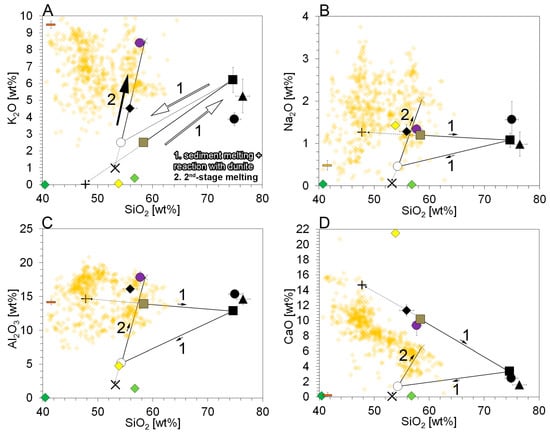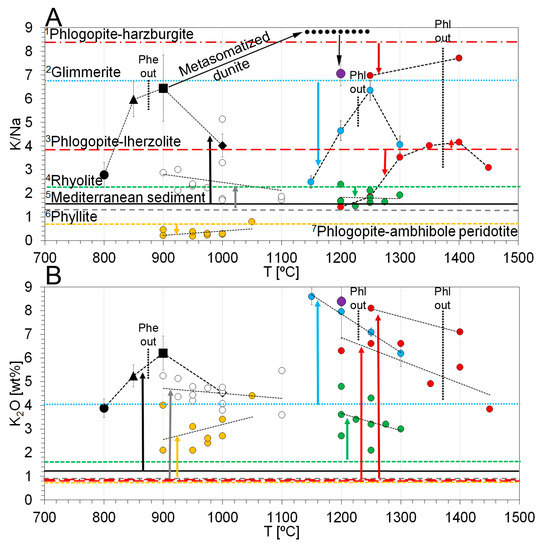 - UP lavas form by direct melting and hybridization of crustal rocks with mantle peridotites in a single stage process at mantle depths [7,62]. Melt inclusions in garnets in ultrahigh-pressure paragneiss (5 GPa) are strongly enriched in potassium and resemble some types of shoshonitic magmas [63]. In this scenario, either the subducted crustal rocks mix with peridotites to form mélanges, or melts of subducted crustal rocks percolate and react with peridotites to form UP melts. This has previously been tested in experiments where a rhyolitic melt with as much as 6.4 wt% K2O was mixed with harzburgite [64], while others hybridized a phyllite (1.9 wt% K2O) with dunite [30,31]. In both cases, experimental melts contain <6 wt% K2O, and K/Na ratios of 4–5, much lower than the 12 wt% K2O and K/Na up to 10 of UP lavas [2]. It is noteworthy that crustal lithologies have a solidus up to 500 °C lower than that of peridotite [21]. Therefore, at mantle temperatures of >1200 °C, crustal lithologies generate Si-rich high degree melts in which K2O is diluted. This is evident from experiments hybridizing rhyolite and peridotite at 1200–1350 °C [19,64], where the maximum K2O mass fraction of the melt (~7.4 wt%) is close to that of the rhyolite component in the starting material (6.4 wt%). Even though these studies did not aim to reveal the origin of UP lavas, their work demonstrates that even high mass fractions of K2O in the starting material do not produce UP melts. In addition, K/Na ratios are lower than in the bulk starting material at >1100 °C, as melting of crustal rocks at high mantle temperatures does not form any Na-bearing phases that can increase K/Na ratios of the melt. All experimental melt compositions of sediment/peridotite hybridization so far fit this pattern [19,30,31,64], with K/Na values of 1–2 at ≥1100 °C (Figure 4A). In contrast, at <1100 °C, where temperatures are below that of the ambient mantle, experimental melts of either sedimentary rocks alone, or melts resulting from sediment/peridotite reaction, reach K/Na values that exceed those of the starting material. This difference in behavior is induced by the interaction between phengite stability and Na2O content of residual clinopyroxene in the sediment layer: as in the case of melting of phlogopite, the highest K/Na of experimental melts are reached after phengite breakdown (at 900 °C; Figure 4A) where all potassium is accommodated within the melt. However, at <1100 °C, the melts are generally Si-rich (SiO2 > 70 wt%), thus high K/Na values are bound to high Si- and low-Mg contents, unlike UP lavas. These results are in accordance with previous experiments by the authors of [30,31], showing that melts produced by sediment + peridotite hybridization are mildly potassic and Si-rich. These may explain the origin of high-K calc-alkaline to shoshonitic lavas [7]. However, hybridization and melting of sediment and peridotite fail to explain the origin of the most K-enriched lavas—lamproites—which form in the same areas as mildly potassic lavas [9].