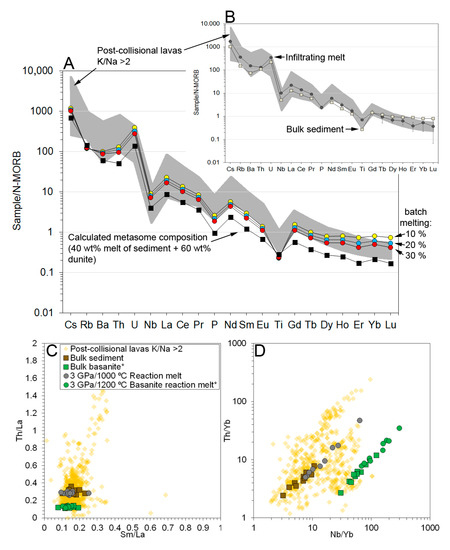 N-MORB normalized trace element compositions of (A) modelled batch melt compositions and (B) starting materials [67] (grey squares, sediment) compared with experimental melts (grey circles, 3 GPa/1000 °C) and post-collisional lavas (shaded area) [9]. The sediment/dunite reaction melts (B) are rich in Cs, Rb, and Ba, and show negative anomalies at Nb, P, and Ti, similar to post-collisional lavas with K/Na > 2. (A) Forty weight percent melt of sediment reacts with 60 wt% dunite to form the calculated metasome composition. Batch melting of the metasome (10–30%) increases the trace element mass fractions to values observed within post-collisional lavas. (C) Th/La versus Sm/La shows experimental 3 GPa/1000 °C sediment/dunite reaction melts at Th/La 0.2–0.6, plotting with the bulk of post-collisional lavas [9], while peridotite melts such as basanite/dunite reaction melts plot at Th/La <0.2 [53]. (D) Th/Yb versus Nb/Yb of sediment/dunite reaction melts plot with post-collisional lavas, while basanite/dunite reaction melts attain higher Nb/Yb ratios and plot largely outside the field of post-collisional lavas [53].