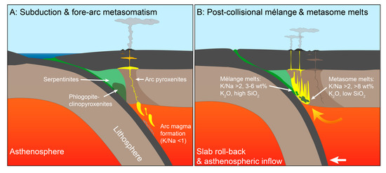 Model for the genesis of post-collisional UP magmatism. (A) Fore-arc mantle is metasomatized by melts of subducting sedimentary rocks; melts have K/Na ratios >2 and react with depleted mantle to form phlogopite clinopyroxenites, leaving a K-depleted residuum that contributes at deeper levels to arc magmas with low K/Na ratios of <1. (B) After slab-rollback (and possibly during continental collision), upwelling asthenosphere introduces heat and melts the metasomes and mélanges. These second-stage magmas are ultrapotassic in composition (K/Na > 2, K2O 3 wt%–6 wt% from crust, and mélanges and up to >8 wt% for metasome melts).