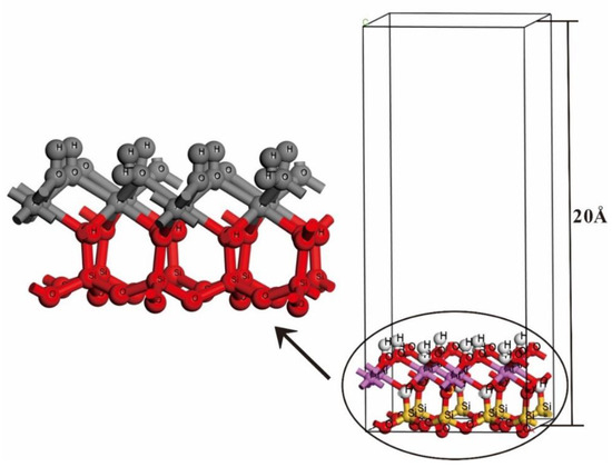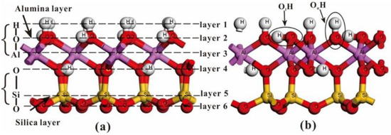 Kaolinite is a layered aqueous aluminosilicate mineral with a triclinic system and belongs to the 1:1 type dioctahedral clay mineral. Its crystal structure is Al4[Si4O10](OH)8. The basic unit of kaolinite consists of a SiO4 tetrahedral layer and an AlO2(OH)4 octahedral layer with its tetrahedron and octahedron interconnected by common oxygen ions, and its unit layers are connected to each other by a hydrogen bond with a van der Waals force between the molecules. A 2 × 1 × 1 kaolinite supercell model is established by expanding the well-optimized kaolinite bulk twice in the a-axis direction, which contains 68 atoms: 8Al, 8Si, 36O, 16H. The large monolayer of the kaolinite model consists of six atomic “sublayers”, which are H–O–Al–O–Si–O from top to bottom. The upper three layers constitute the “Alumina layer”, and the lower three layers constitute the “Silica layer” (Figure 1a). From the kaolinite (001) surface, the hydroxyl group on its inner surface could be two types: one third “lying” hydroxyl (OlH) oriented parallel to the kaolinite (001) surface and two thirds “upright” hydroxyls (OuH) oriented perpendicularly to the surface (Figure 1b).