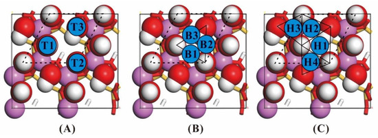 Similar to Hu [49] and Zhao [26], three categories of NH3 adsorption position of were established on the kaolinite surface (Figure 3) based on the configuration and symmetry of the relaxed (001) surface of kaolinite. They are “top” positions (the adsorbed atom N directly above the active atom O), “bridge” positions (the adsorbed atom N between the two active atoms O) and “hollow” positions (the adsorbed atom N is bounded by three or more active atoms O). Considering the adsorption properties of NH3, the “top”, “bridge” and “hollow” positons have three, three and four different adsorption positions respectively. Since NH3 has no periodicity, build a 15 × 15 × 15 Å3 periodic cell to optimize NH3 molecular which is placed in the center of the cell. The model parameters used in the optimization of the kaolinite surface model are from the optimized kaolinite unit cell of this study.