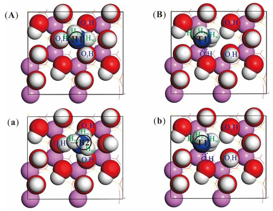Figure 4 is the atom positional changes of kaolinite and NH3 before and after their adsorption of the “hollow1” with the largest adsorption energy and the “top1” with the lowest adsorption energy. NH3, which originally located in “hollow1”, shifted to “bridge2” after adsorption, and the N atom of NH3 is closer to the kaolinite surface “vertically”. HN1, HN2 and HN3 are the H atoms of NH3 molecure, they are far from the surface. All the H atoms of the hydroxyl group on the surface of kaolinite are gathered in the direction of the middle N atom (Figure 4A,a). The position of NH3 adsorbed on “Top1” was nearly unchanged before and after adsorption, and the surface of kaolinite did not change greatly (Figure 4B,b). So, the larger the adsorption energy, the greater the NH3 positional shift, and the stronger the reaction with the adsorbent.