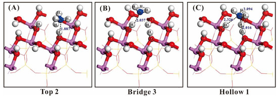 Bond formation and bond length of NH3 adsorbed at the position of “Top2”, “Bridge3” and “Hollow1” (the white ball: H; the red ball: O; the blue ball: N; the purple ball: Al). (A) is the “Top2” position, (B) is the “Bridge 3” position, (C) is the “Hollow 3” position.
