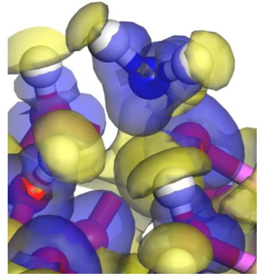 The electron density difference between adjacent atoms can describes the electron rearrangement and the electron transfer before and after surface adsorption. The “Hollow1” site has the largest adsorption energy in NH3/kaolinite system and Figure 6 plots the electron density difference of “Hollow1” site before and after surface adsorption. In Figure 6, the yellow region between atoms represents the accumulation of electrons, and the blue region represents the depletion of electrons, and the color distribution showed a significant electron density depletion around the N atom and accumulates around H1 and H2, while the electron density around the HN1 atom accumulates and the electron density around the O3 atom is consumed.
