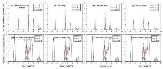 Density of state (DOS) is one of the most important parameters for describing the state of motion of electrons in solid physics [50,51]. Figure 7 is a partial density of state (PDOS) image of NH3 before and after adsorption at different adsorption sites on the kaolinite (001) surface. Figure 7A–D represent the PDOS diagram of the s, p orbital energy levels and the sum of two orbital energy levels of the free NH3 molecules before adsorption and those of “top”, “bridge” and “hollow” (“Top2”, “bridge3” and “hollow1”) positions on the kaolinite surface after adsorption. For comparison, we also calculated the PDOS diagram of the H and O two-layer atoms involved in the adsorption of kaolinite (001) surface. Figure 7a is the image before adsorption and Figure 7b–d is the image after adsorption, including the s, p orbital energy levels and the sum of the two orbital energy levels.
