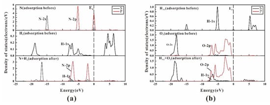 The partial density of states plots in Figure 8a, shows that the nonlocality of 2p-orbitals of N atoms in NH3 increase after adsorption. The electron density of states disappears at Fermi level, and the whole density of states moves towards the direction of energy reduction after the interaction between N atom and H1 atom of kaolinite surface, indicating that the NH3/kaolinite (001) system is stable after adsorption. With Fermi level as the boundary, the bonding between 2p-orbital of N atom of NH3 and 1s-orbital of H atom of kaolinite surface on the left side of Fermi level is from −10~0 eV, and the anti-bonding between them on the right side of Fermi level is 2.5~7.5 eV. According to the wave crest height of density of states, bonding is much stronger than anti-bonding, so N–H1 bond. The density of states in Figure 8b shows that the anti-bonding between the 1s-orbital of HN1 atom of NH3 and the 2p-orbital of O3 atom on surface is very weak, and the bonding effect is relatively strong, so HN1–O3 can bond. As a result, NH3 can strongly adsorb on the (001) surface of kaolinite.