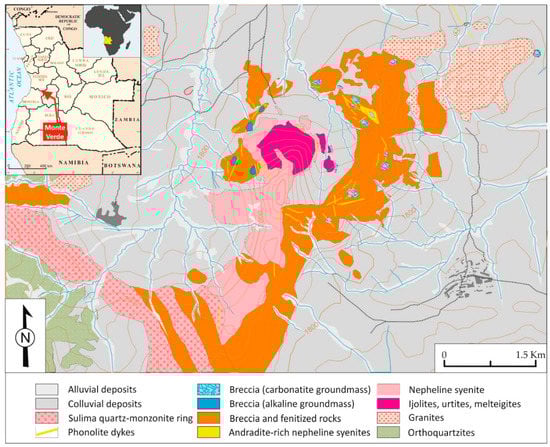 The Monte Verde complex displays a concentric semi-circular structure defined by alkaline rocks surrounded by fenitized Precambrian granites. Colluvial and alluvial deposits cover the central and north-western area, hiding most outcrops. No intrusive carbonatite bodies occur, and only a few small outcrops of carbonatite breccia have been distinguished. However, carbonatitic rocks are very common in most of the other sub-volcanic Angolan complexes, such as Tchivira, Bonga, Virulundo, or Bailundo [,,,].