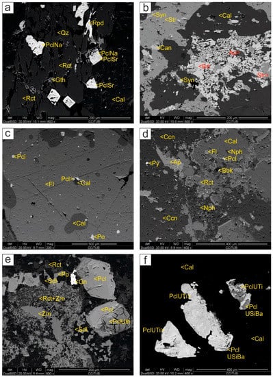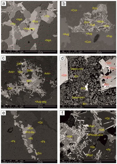 - Foidolitic: which tends to be groundmass-supported, and feldspathoids (nepheline and sodalite, more or less replaced by cancrinite) are the most abundant minerals, replacing K-feldspar and albite. In addition, fluorapatite, anhedral biotite, calcite, richterite-ferrorichterite and fluornatropyrochlore occur as minor components. Pyrochlore occurs as euhedral inclusions inside all the above-mentioned minerals, suggesting its early crystallization from the melt. Nepheline appears to be associated with zircon. Cancrinite could have an important metallogenetic role, as it often appears intergrown with fluorite, calcioancylite-(Ce), burbankite, and secondary pyrochlore (Figure 4d). Late sodalite replaces albite and nepheline. A new generation of U- and Ti-rich pyrochlore is associated with sodalite and replaced earlier pyrochlore types. Because of its U content, it presents intense fracturing due to metamictization processes (Figure 4e). Rare rounded ilmenorutile is also overgrown by Mn-rich ilmenite, secondary fine-grained Na-rich-calciopyrochlore, pyrrhotite, and galena (Figure 5b, Table 2).