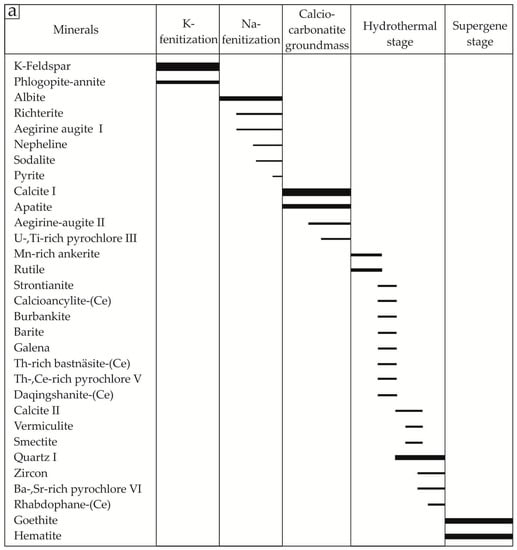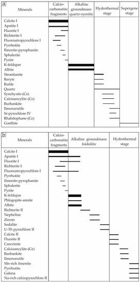 - Chakhmouradian, A.R.; Zaitsev, A.N. Rare earth mineralization in igneous rocks: Sources and processes. Elements 2012, 8, 347–353. [Google Scholar] [CrossRef]