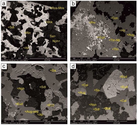 Nb and REE phases in the Monte Verde alkaline dykes. SEM images, BSE mode. (a) Rosenbuschite-mosandrite (Ros-Mos) poikilitic crystals replaced by rinkite (Rin) overgrowing sodalite (Sdl), albite (Al), and sanidine (Sa) of the mesostase—replaced by albite (Ab) and burbankite (Bbk). (b) Perovskite (Prv) and titanite (Ttn) replaced by loparite (Lpr) and niobian titanite (Ttn-Nb), respectively, with cancrinite (Ccn) and albite (Ab). (c) First generation of poikilitic eudialyte (Eud) intergrown with aegirine augite (Aug-aeg), albite (Al), sanidine (Sa), and nepheline (Nph)—replaced by sodalite (Sdl). (d) Eudialyte (Eud), aegirine augite (Aug-aeg), sanidine (Sa) replaced by calcite (Cal) associated with sodalite (Sdl), burbankite (Bbk), and nosean (Nsn). Note a late generation of secondary eudialyte overgrowing the former.