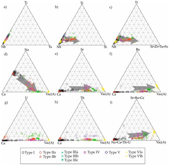 Chemical composition of pyrochlore generations of Monte Verde. Ternary diagrams from (a–c) correspond to B-site changes, whereas (d–i) represent the A-site. Grey arrows indicate evolution trends from primary generation to secondary [,].