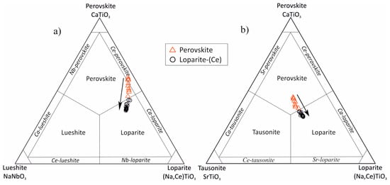 Chemical composition of the perovskite mineral group. (a) Ternary diagram NaNbO3-CaTiO3-(Na,Ce)TiO3; (b) Ternary diagram SrTiO3-CaTiO3-(Na,Ce)TiO3. Classification diagrams of the perovskite group according to Mitchell []. Arrows indicate evolution trends from early perovskite to secondary loparite-(Ce).