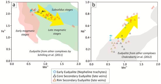 Variation of chemical composition of eudialyte from Monte Verde. (a) Mn2+ vs. Fe2+ diagram; (b) Mn2+ vs. Nb5+ diagram. Eudialyte from Monte Verde is compared to eudialyte from the Illimaussaq (Greenland), Tamazeght (Morocco), and Mount-Saint-Hilaire (Canada) alkaline complexes [,]. Yellow arrows indicate the evolution trend of Monte Verde eudialyte.