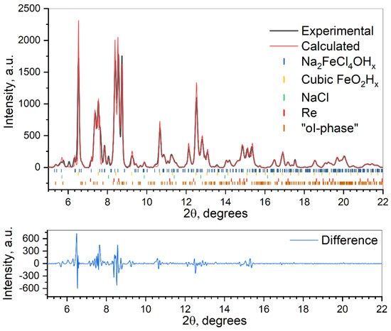 Hydrous phases have been attracting great interest in the geological community due to their importance for the behavior and physical properties of the Earth’s mantle [1,2]. One of such compounds, α-FeOOH (stabilized as goethite at the ambient conditions, which is a common material in the banded iron formations, or BIFs), is expected to submerge into the lower mantle with subducting slabs, bringing water to the lowermost mantle and the core–mantle boundary (CMB), as it was suggested in some publications [3,4]. Recently, a number of studies were dedicated to studying the behavior of FeOOH at high P-T conditions, which show that FeOOH undergoes a series of phase transitions. A “pyrite-type” FeO2Hx phase is expected to be stable at the P-T conditions of lowermost part of a mantle and core–mantle boundary [5,6,7]. This phase is attracting the attention of the community and is being intensively investigated via density functional theory calculations and spectroscopic studies [5,6,7,8,9]. In some experiments performed in DACs, alkali halides (such as KCl, for example, ref. [9]) are used as a pressure-transmitting medium and thermal insulator for laser heating. It is assumed that alkali halides are fully chemically inert and cannot complicate data analysis. However, at very high pressures and temperatures, the chemistry of materials may change, and iron oxyhydroxide could potentially interact with the alkali halides. Information on the possible reactions between FeOOH and alkali metal halides at extreme conditions and the crystal structures of possible products is absent. Methodologically, it is of great importance to verify the reactivity between these species.