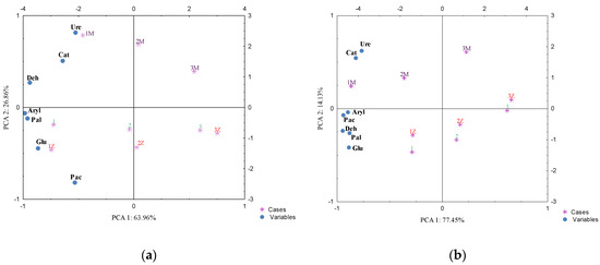 The principal component analysis (PCA) of the microorganism count demonstrated the inhibitory effect of cobalt on the tested parameters (Figure 2a,b). The position of vectors indicatedthe similarity of the reaction of two groups of microorganisms: In loamy sand (Figure 2a)—of fungi and Actinobacteria, and in sandy clay loam (Figure 2b)—of organotrophic bacteria and fungi. The occurrence of these microorganisms was limited by the smallest dose (20 mg Co2+ kg−1 of soil) and increased with increased cobalt contamination (80 mg Co2+ kg−1 of soil). The distribution of cases with respect to the vectors describing these groups of microorganisms indicated the stimulating action of the Bio.Zeo.S.01 zeolite and the molecular sieve. The highest number of microorganisms was observed on the 60th day of the experiment, which was confirmed by the distribution of cases in relation to the vectors.