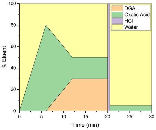 The offline separation protocol was adapted from Roach et al. [28]. Each injection had ~30 min separation (1 mL min−1) which included a 5 min washing step (5% oxalic acid and 95% water) at the end of the separation. The sample was loaded onto the column in water and then followed an elution profile seen in Figure 1 to separate the REEs. The uranium matrix was subsequently removed. Fractions were collected in 30 s increments starting at 6 min, which is when the oxalic acid eluent was first introduced to the column, for a preliminary screen to determine elution time. Subsequently, fractions were collected only at the times that each element was eluted from the column.