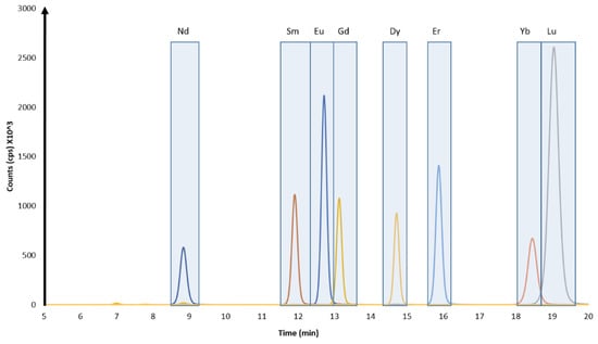 To eliminate the interference effects for the IDMS measurement, the REE are separated by an ion-exchange column and elute in order of their atomic radii (largest to smallest) [27,31]. A representative chromatogram of the elution profile of the REEs of interest can be seen in Figure 2. The blue boxes around each peak indicate where each fraction was targeted if offline analysis was warranted. There are two elemental systems where slight coelution in the fractions was observed. The first, Eu and Gd, does not suffer from isobaric interferences between these elements (Table 1) and thus the IDMS calculation is not affected. The second, Yb and Lu (176Yb and 176Lu), requires a correction to remove the Yb counts from the Lu fraction. This correction is made using Equation (2).