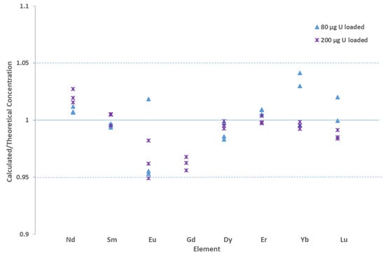 Most of the REEs were resolved from isobaric and polyatomic interferences in the CUP-2 sample. Only the Lu fraction had a significant interference present, 176Yb, which comprised approximately 30% of the total 176Lu counts. This interference was corrected (Equation (2)) to account for the Yb contribution. The REE concentrations determined were comparable (<5% relative difference, %RD) to previously reported values [32]. There was a slight improvement with the analysis with the larger mass loading as seen in Figure 3, this is due to the improved counting statistics with the collected REE fractions. There were slight issues with the Gd analysis, at the smaller sample loading, which is somewhat expected with the low natural abundances for the isotopes chosen (152Gd and 154Gd, 0.2% and 2%, respectively). The larger U loading did not negatively impact the overall methodology (separation and analysis). With larger loading, the sample can be directly injected into the HPIC, thus improving the overall method sensitivity.