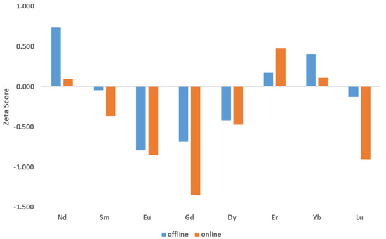 Representation of the calculated zeta scores comparing the offline and online methodologies.