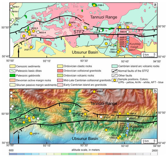 Figure 2. (a) Simplified geological map of the South Tannuol Fault Zone (STFZ) (based on [5]) with sample positions indicated; (b) digital relief model (SRTM data, Mercator projection—WGS84) of the STFZ with indication of main structural features, basins and mountain ranges. Sample sites are indicated, see Table 1 for details.