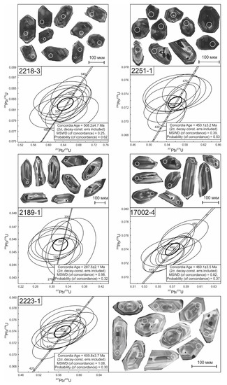 The results of the zircon U/Pb dating are shown alongside previously published results [5,6,7] in Table 2 as arithmetic mean values grouped over all analyzed grains. In this study, five zircon U/Pb ages were obtained for samples 2218-3, 2251-1, 17002-4, 2223-1 and 2189-1. The resulting concordia plots and CL images of the analyzed zircons are shown in Figure 3.
